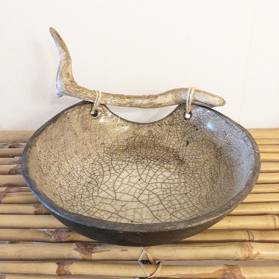 Large raku bowl with kintsugi and driftwood handle