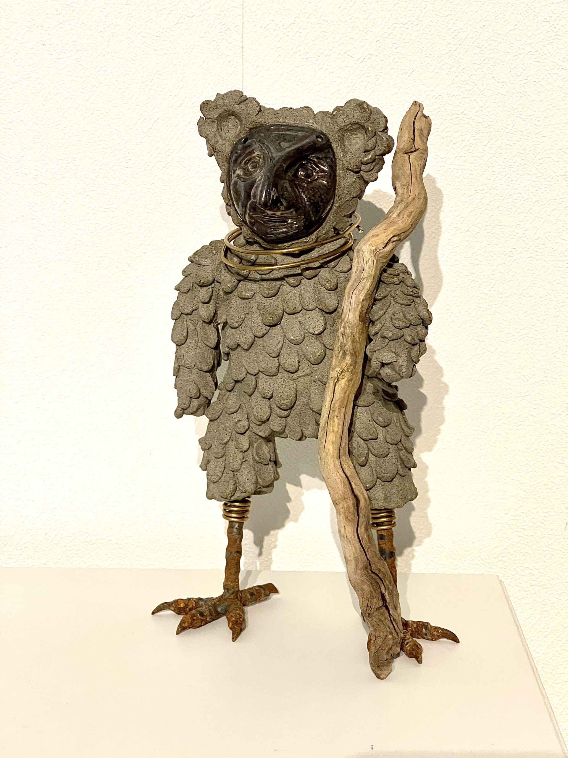Stoneware ceramics with metal and driftwood details, about 25cm high